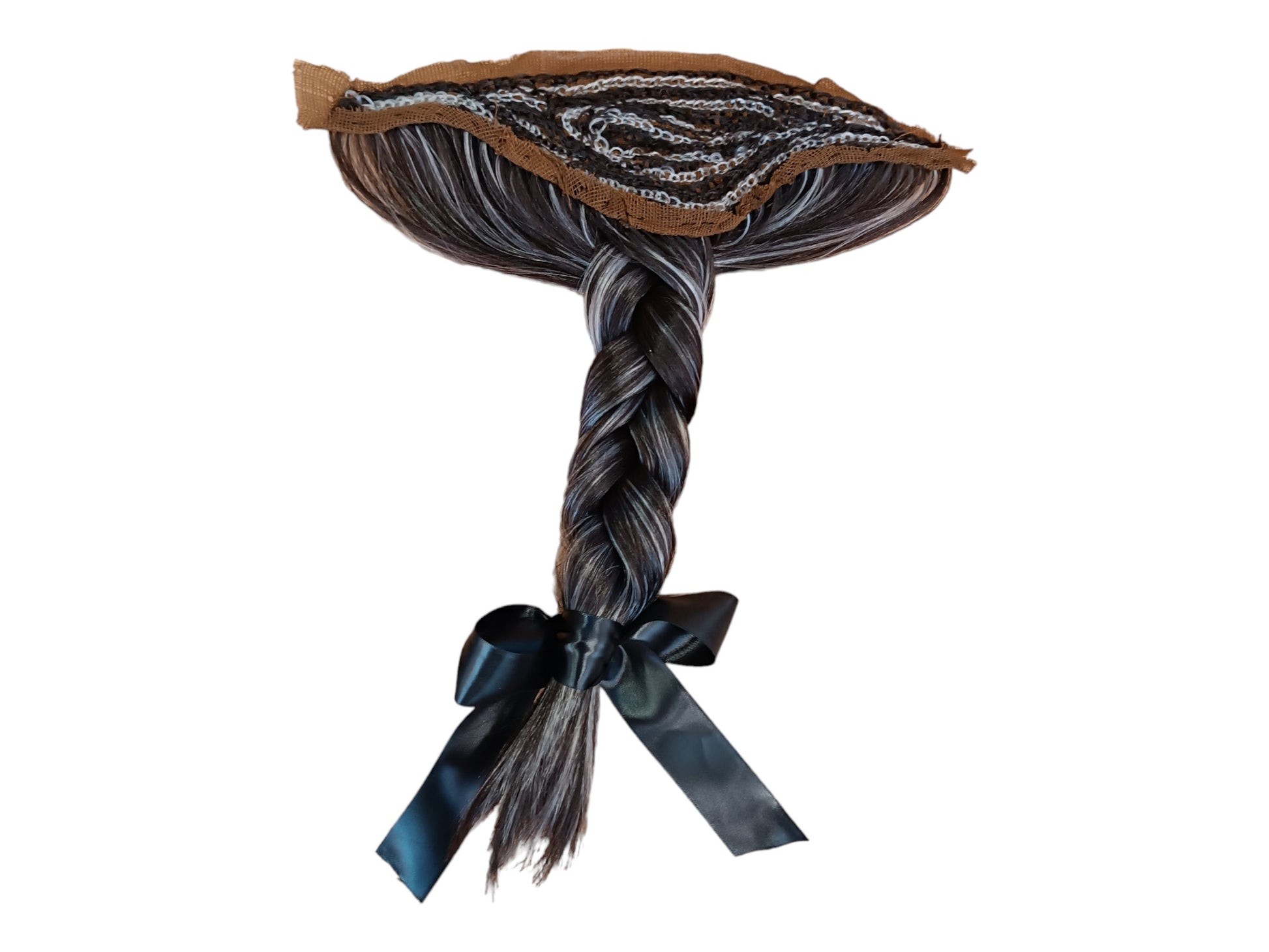 A Renaissence Brown Gray Queue that can be added to a hat. Two thirds of the hair is Brown and one third is gray.