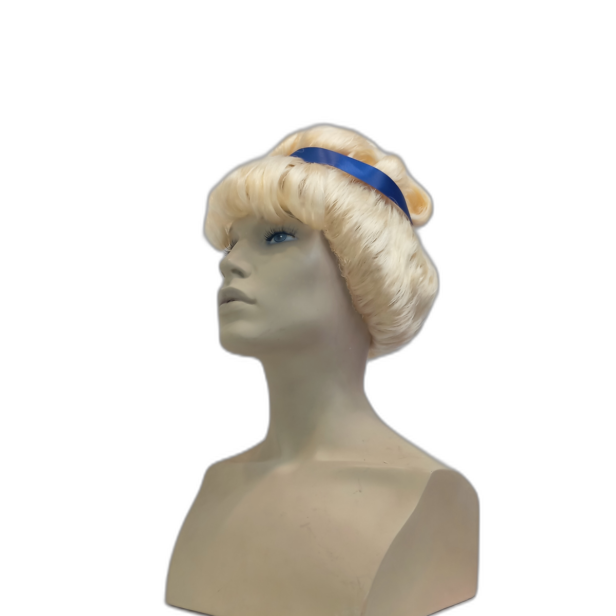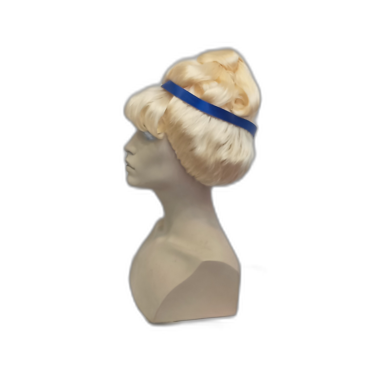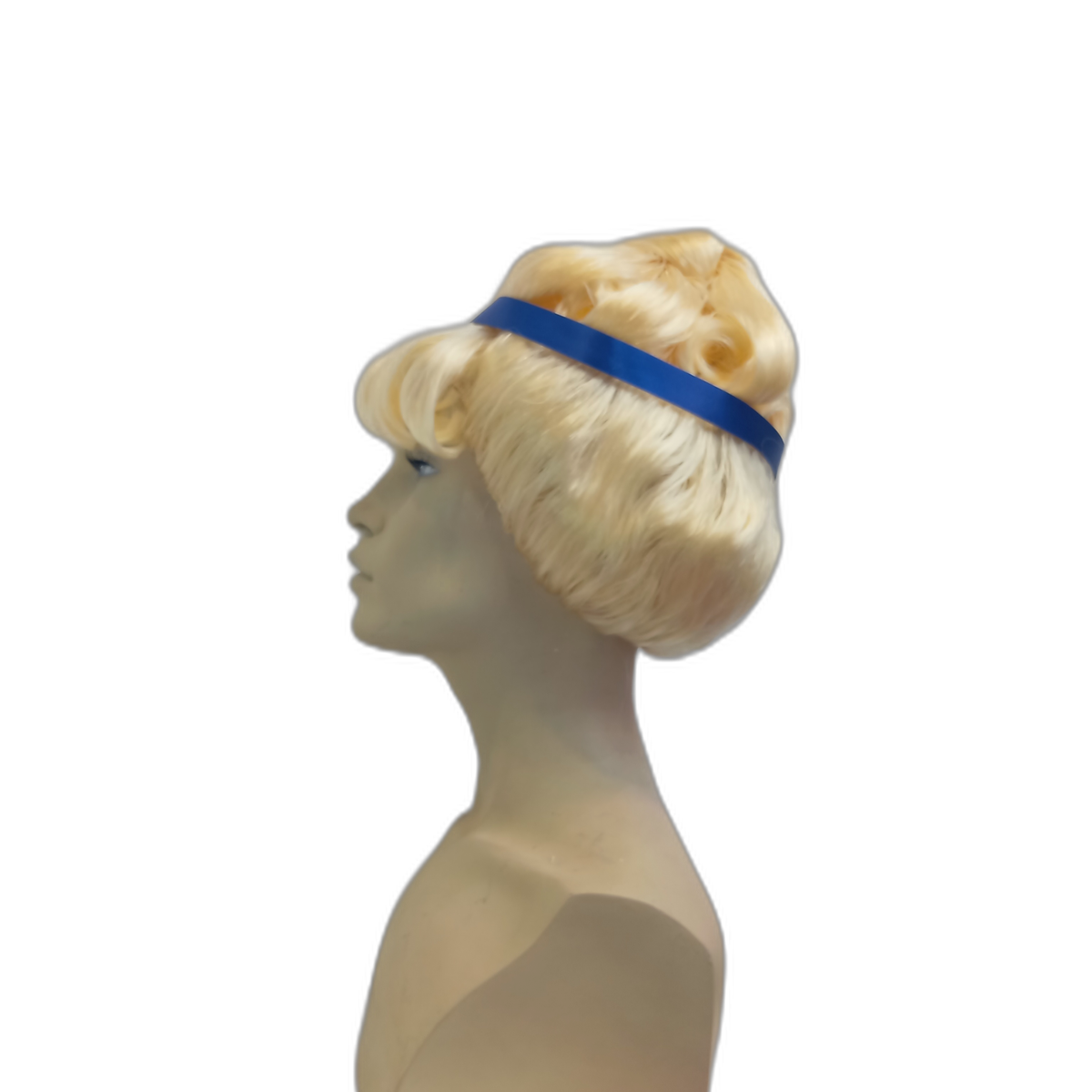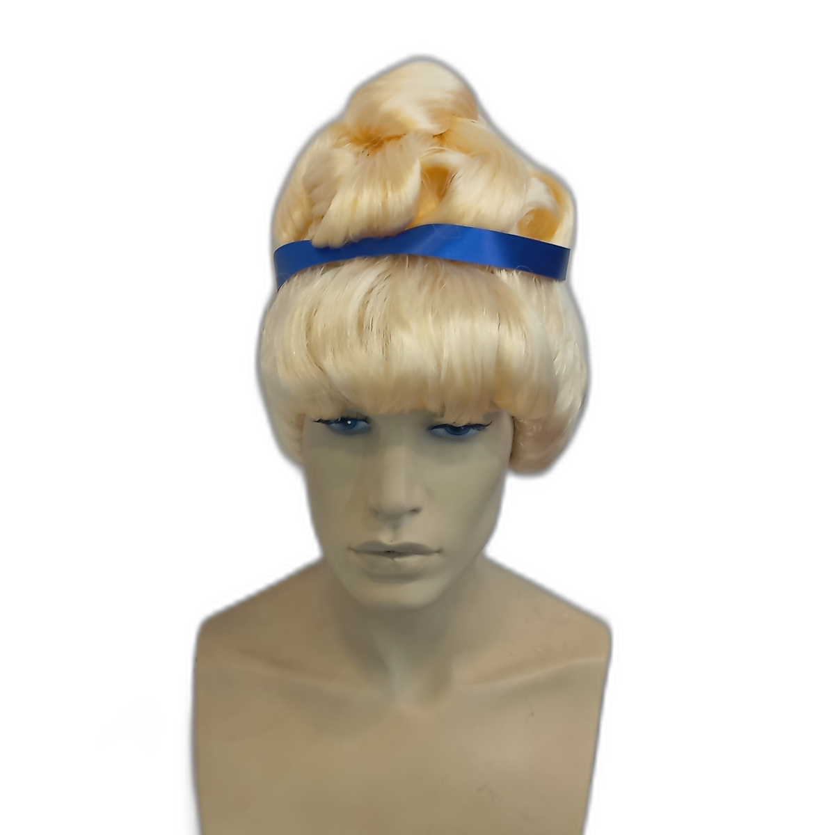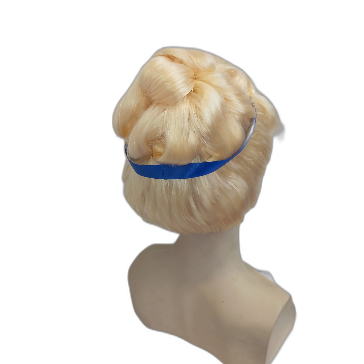 A glossy blue ribbon encircles the crown, adding a distinct accent that contrasts with the pale blonde tones. The overall silhouette evokes a regal or fairy-tale aesthetic, reminiscent of classic storybook characters or formal period styling. The craftsmanship emphasizes balance and texture, with each curl contributing to the sculptural quality of the design.