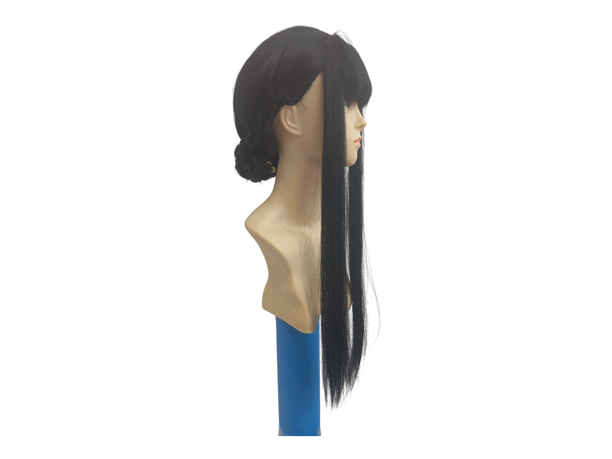 Ideal for cosplay events, stage performances, or fashion enthusiasts seeking a refined silhouette, this wig offers a clean and dramatic look; featuring long, straight hair with bangs and subtle layers that frame the face gracefully.