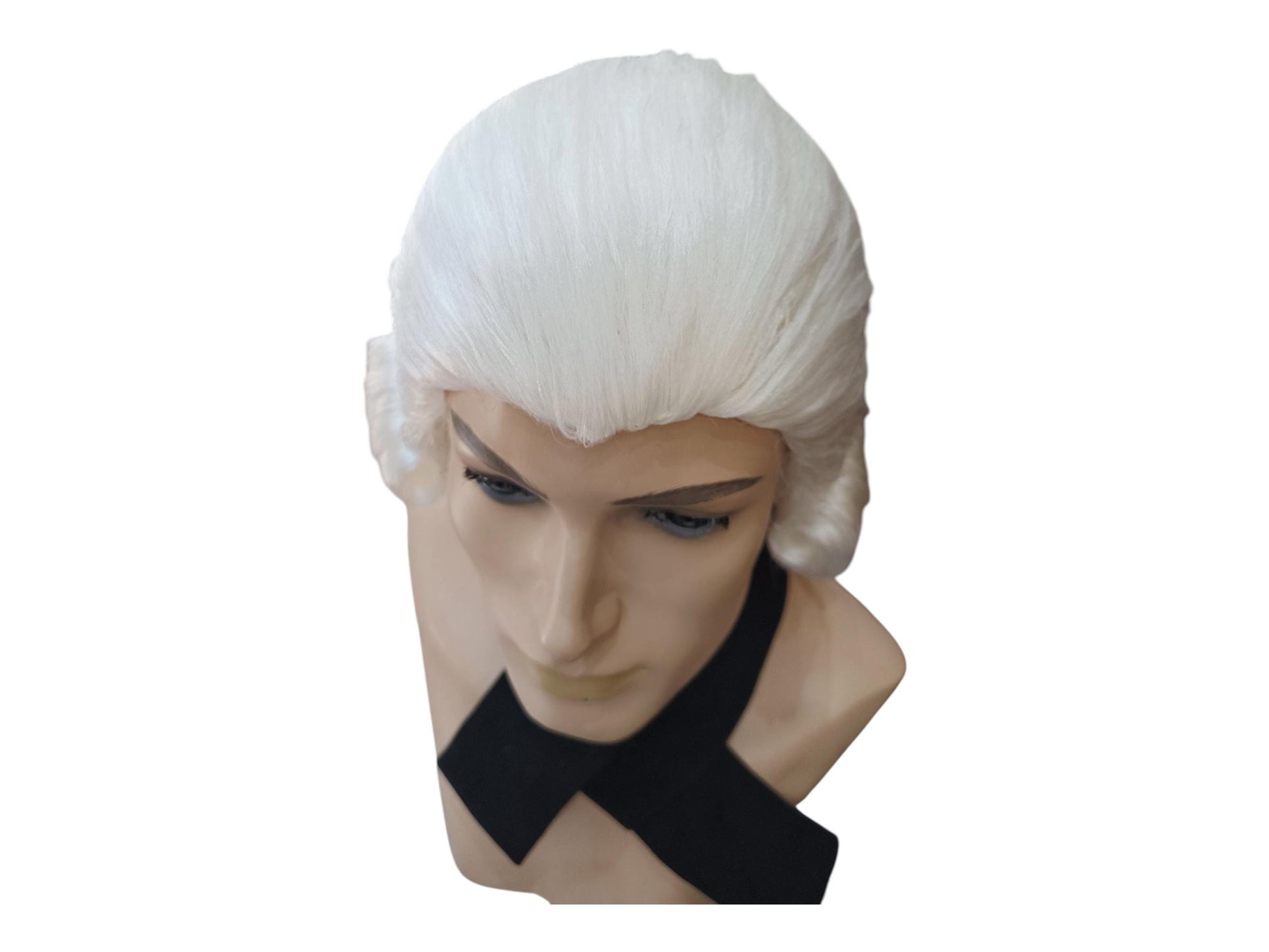 Ideal for judicial, diplomatic, or noble roles from the Revolutionary and Napoleonic periods, this wig combines theatrical presence with historical accuracy. Tied with a black ribbon at the back and styled in soft rolls above the ears, it delivers a dignified silhouette suitable for both stage and reenactment.